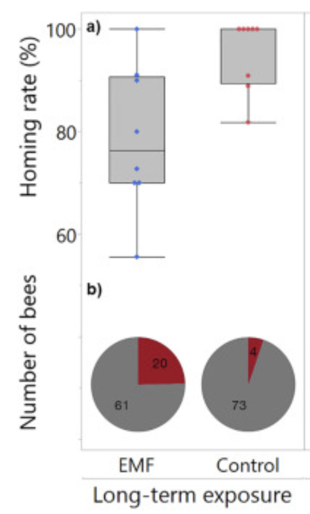 Toch viel een zaak op bij bestuderen van aantal onderzoeken en dat betreft het bewijs dat RF-EMF signalen (frequentiespectrum 100 kHz – 3 GHz) een significant effect heeft op het aantal bijen dat de weg terug weet te vinden naar hun bijenkast. In dat artikel staat een figuur die dat verschil aangeeft (bedenk dat er onzekerheidsintervallen aangegeven zijn) en wijst er op dat er gemiddeld 78% van de bijen terugkeert i.g.v. straling en 95% als die straling afwezig is.
